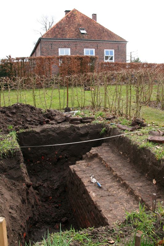 Op de voorgrond een deel van de fundering behorende bij het kasteel Lichtenvoorde. Op 40 cm onder het maaiveld wordt de massieve 1,50 meter brede fundering aangetroffen. De eerste laag bakstenen ligt op een stevige eikenhouten constructie. Van een van de planken bleek de eerste jaarring uit het jaar 1491, het ‘geboortejaar’ van de eik. De laatste jaarring van de plank is gevormd in 1580. Niet alle jaarringen van de boom zijn in de plank aanwezig. Daarom gaan de experts ervan uit dat de eik rond het jaar 1600 geveld is. Het muurwerk zal rond die tijd aangelegd zijn. Het gaat waarschijnlijk om de fundering van een (ring)muur om het kasteel.