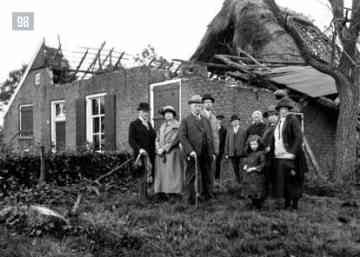Bij de foto: Een groepje ramptoeristen met de getroffen familie Ten Have (Steggat) voor de verwoeste boerderij aan de Koolmansdijk in Lievelde.